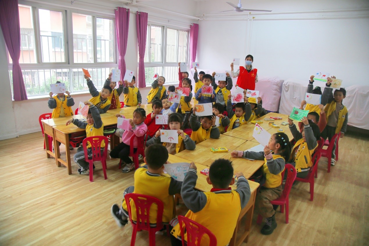 志愿者们带领小朋友一起观看国民历史普及动画片《那年,那兔,那些事》,用他们能听懂的语言讲述了中国共产党诞生的原因以及发展过程,在小朋友们的心里埋下一颗爱国的种子。入党积极分子们教小朋友为五星红旗和党旗上色,为他们讲述那些与五星红旗和党旗紧紧相连的动人故事,帮助他们理解旗帜各部分的寓意和蕴含的伟大精神。活动在大家共同演唱《红星闪闪》中结束。