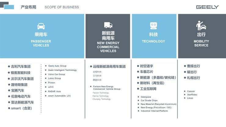 浙江吉利控股集团1997年进入汽车行业,致力于成为具有全球竞争力和影响力的智能电动出行和能源服务科技公司,业务涵盖汽车及上下游产业链、智能出行服务、绿色运力、数字科技等,旗下有吉利、领克、极氪、几何、沃尔沃、极星、路特斯、伦敦电动汽车、远程新能源商用车、雷达新能源汽车、曹操出行、礼帽出行等汽车品牌。吉利控股集团连续十二年进入《财富》世界500强(2023年排名225位),是全球汽车品牌组合价值排名前十中唯一的中国汽车集团。