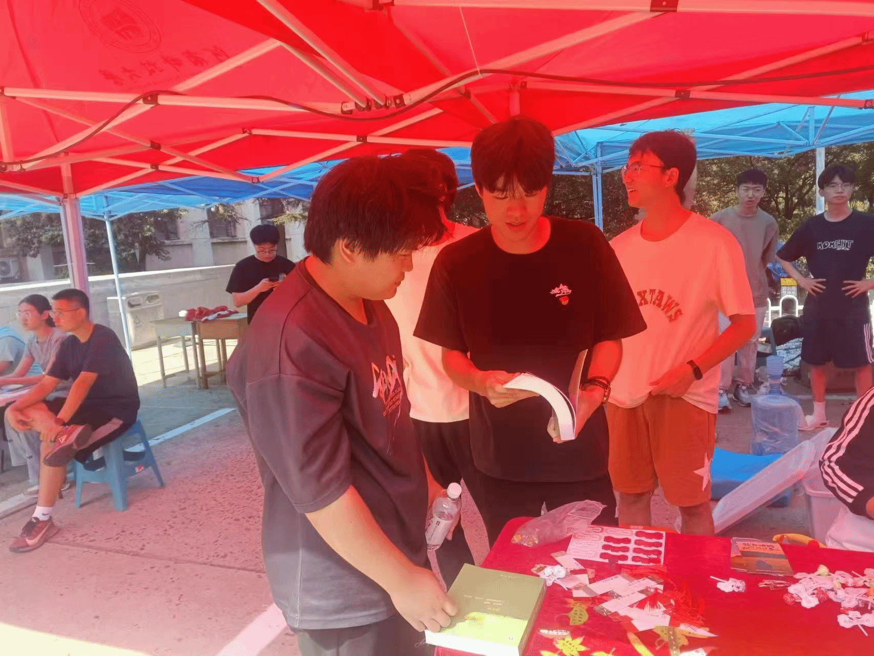 大巴到达校园。党员志愿者为报到新生宣传赏金猎人游戏