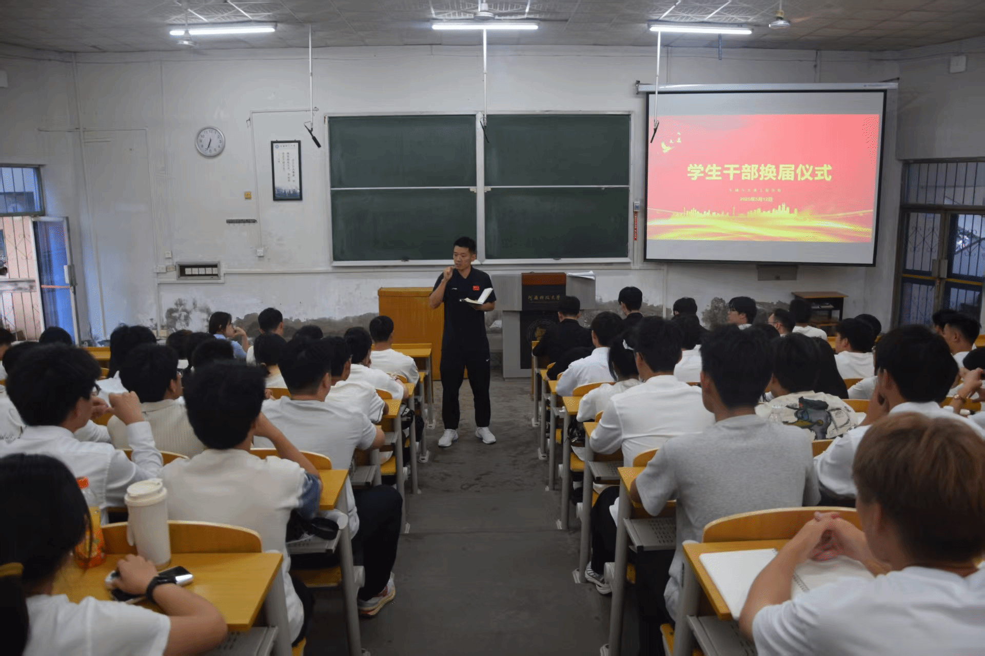 在6号楼102举办学生干部换届仪式。本次仪式由学工办副主任兼2022级辅导员张亮亮主持。团委副书记兼2023级辅导员王裴君,2024级辅导员焦雪猛出席,学生会、青年志愿者协会、先锋传媒中心、共青团赏金猎人游戏