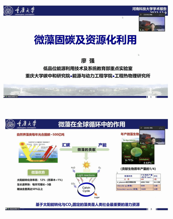 廖强教授首先从微藻固碳背景及现状展开,介绍了藻类在地球生命演化中和全球循环中的作用、微藻的贡献、微藻在固碳和能源化利用的潜力等;其次,从“多相流动与生化反应体系中气液两相界面现象、微藻固碳机理解析、高效固碳藻种筛选与改造”等方面深度剖析了微藻的固碳过程和固碳机理;随后,基于“微藻高值化能源化梯级利用、成分调控及利用”方面讲解了微藻的高值化利用;最后,解释了微藻减排技术的工程应用,展示了已完成的全国首个和全国最大微藻固定煤化工烟气CO2产业示范项目,并提出在应对“双碳”目标下的微藻固碳技术展望。廖教授的讲座充分展示了多年来丰富的科研成果和富有想象力的学术创新思路。同时与会老师、同学与廖教授连线进行了深刻的学术讨论和创新性思维形成的探讨。