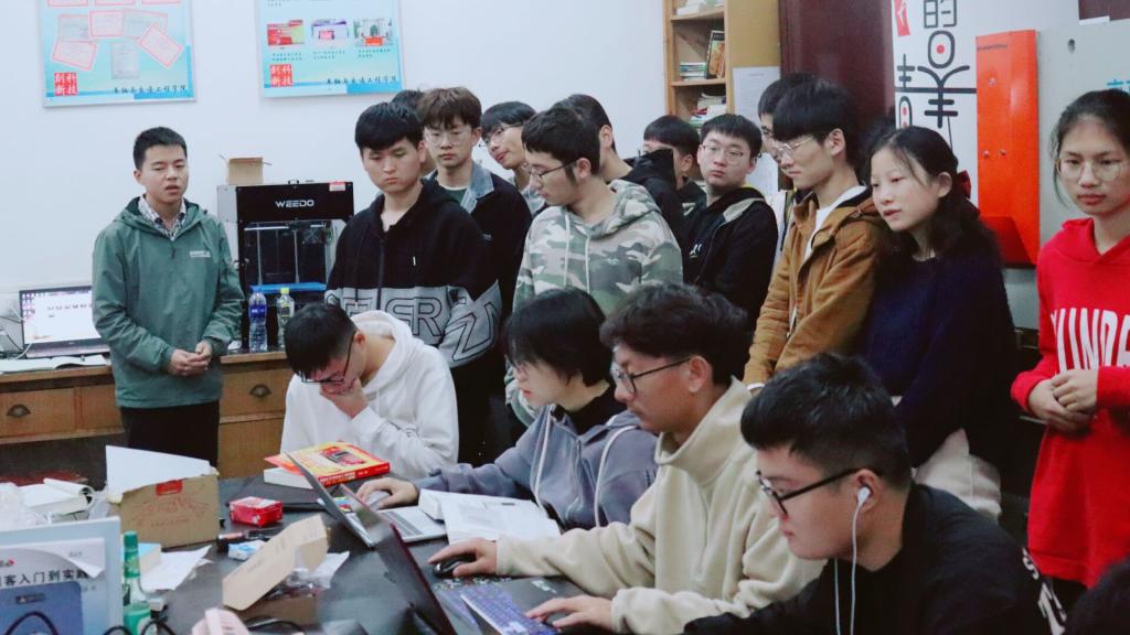 7:40交流活动开始。首先由科创大二负责人张斌来给他们介绍科创的整体情况,如科创具体的分组情况和大体成员概述,具体讲解了科技创新协会的发展历程与发展前景。接着由徐宏伟介绍科创一楼办公室,具体介绍了一楼的电子组和工具组负责的项目和功能,还包括了科技创新协会大一新成员学习的内容。接着由张满奕对农工科技创新中心全体成员依次介绍了一楼的设备:对其中3D打印机,机床等各个设备的功能以及要点进行了详细的讲解。然后由雍佳俊介绍电子组的具体明细以及作品,向农工科技创新中心成员展示了平衡小车等科技创新协会的作品。最后,参与本次活动的成员进行了合影留念,到此交流会圆满结束。
