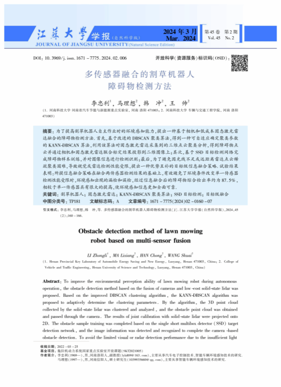 19 多传感器融合的割草机器人障碍物检测方法-江苏大学学报