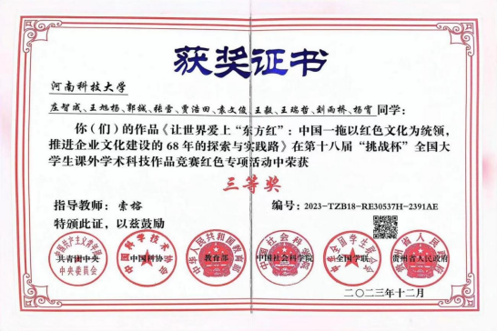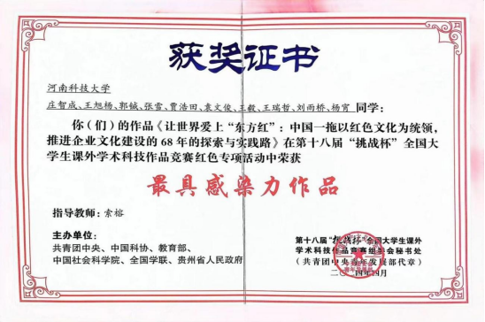 第十八届“挑战杯”全国大学生课外学术科技作品竞赛红色专项国家三等奖
